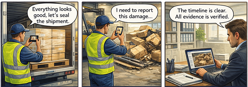 Cargo is photographed at the moment it is loaded and its condition is sealed into evidence.